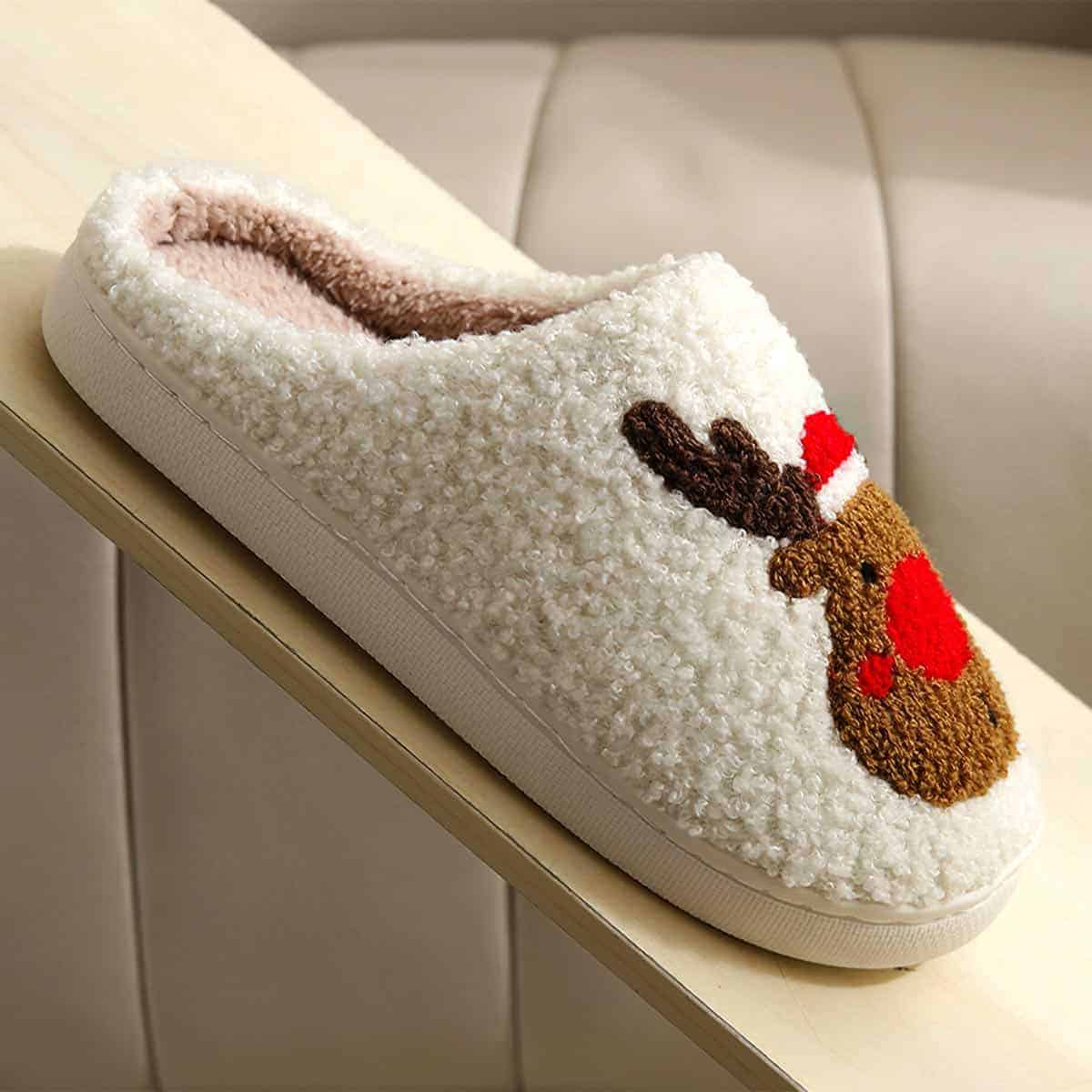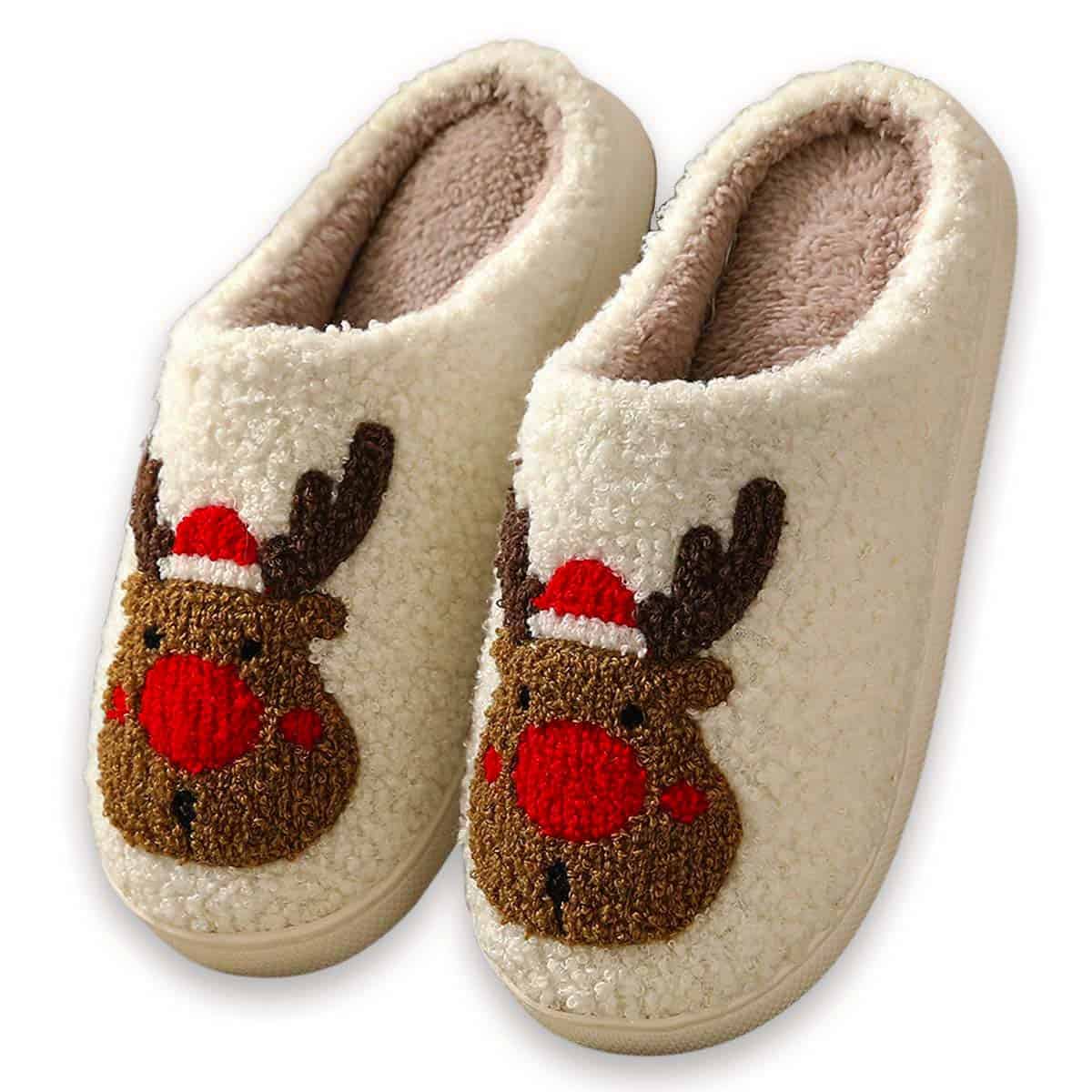 Plongez dans la magie des fêtes avec ces chaussons de Noël blancs ornés d’un adorable renne au nez rouge. Confectionnés avec une peluche moelleuse d’une douceur exceptionnelle, ils apportent un confort absolu lors de vos soirées hivernales. Le design festif met en scène un renne malicieux aux pommettes roses, coiffé d’un bonnet de Noël rouge et blanc, créant une atmosphère chaleureuse et joyeuse à chacun de vos pas.