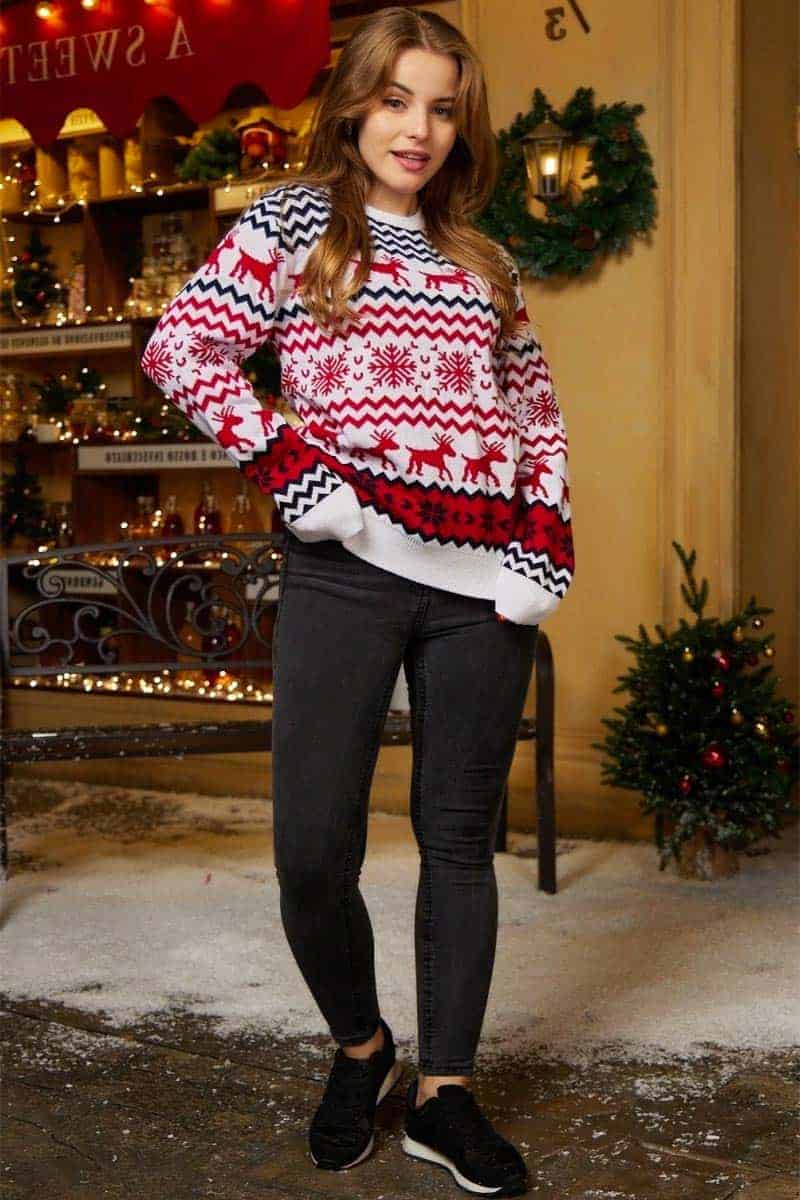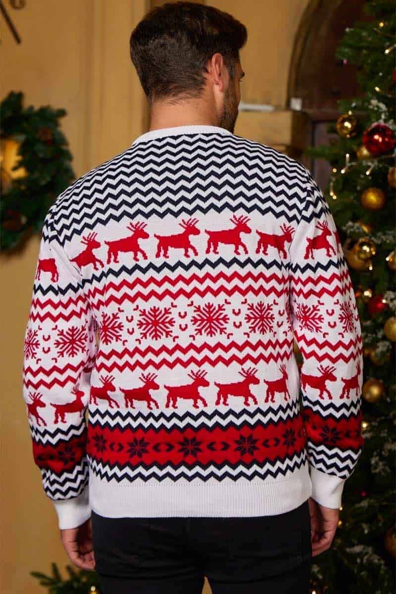Célébrez la magie des fêtes en duo avec ce pull de Noël couple blanc au charme traditionnel nordique. Sa maille fine et délicate arbore un magnifique motif jacquard composé de rennes majestueux et de flocons de neige dans des tons rouge et noir qui se détachent élégamment sur le fond blanc immaculé. Ce pull festif capture parfaitement l’esprit chaleureux et romantique des célébrations hivernales.