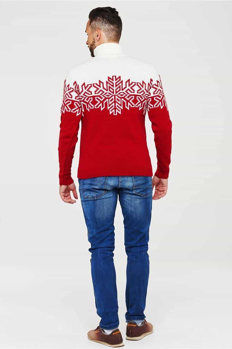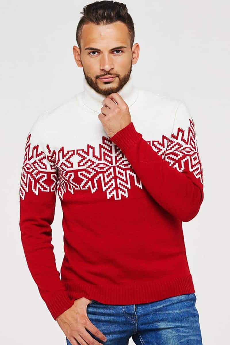 Le col roulé apporte une touche sophistiquée tout en garantissant une chaleur optimale. Les motifs nordiques traditionnels, délicatement tissés au niveau de la poitrine et des épaules, créent un contraste saisissant avec le rouge profond du pull. La fine maille assure un tombé impeccable et une liberté de mouvement appréciable lors des festivités.