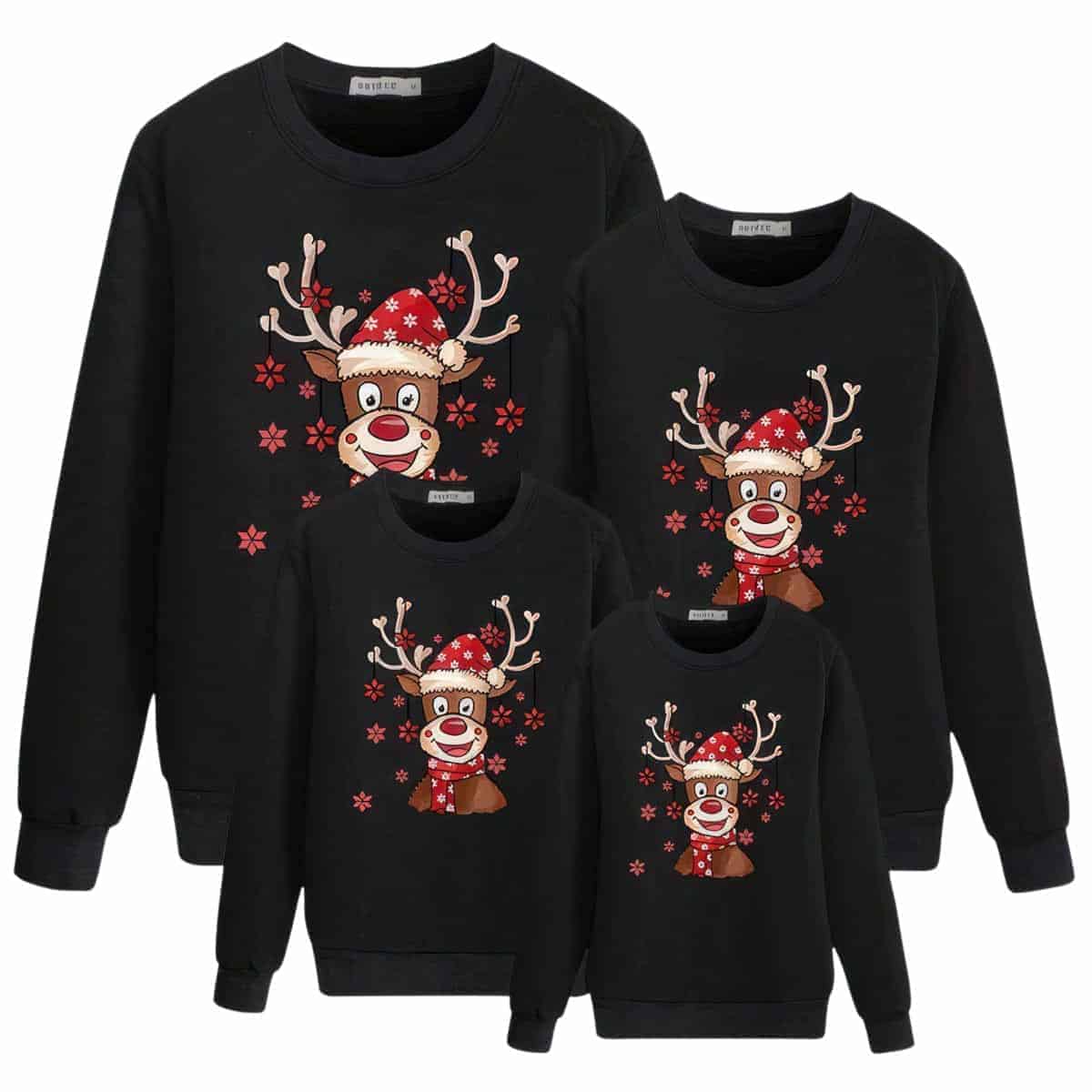 Créez des souvenirs magiques en famille avec ce pull de Noël noir enchanteur. Son adorable renne coiffé d’un bonnet rouge et les flocons de neige dansants capturent parfaitement l’esprit festif. En coton doux avec une coupe classique, il s’adapte à tous les membres de la famille. Parfait pour vos photos de fêtes et moments chaleureux ensemble.