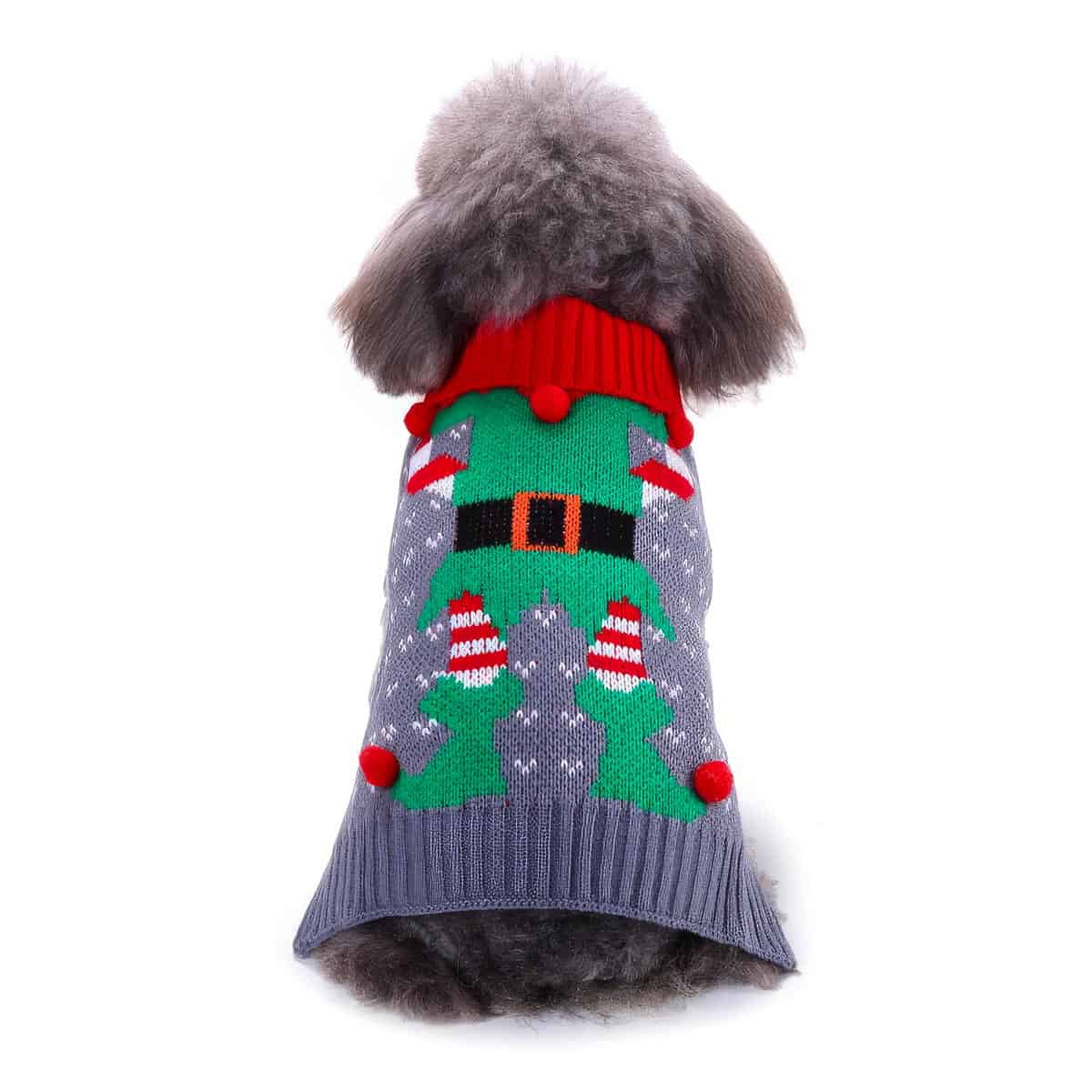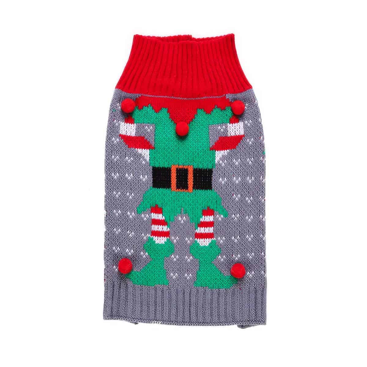 Transformez votre compagnon en adorable lutin des fêtes ! Ce pull de Noël pour chien gris se distingue par son motif lutin festif et ses charmants pompons rouges. Son col roulé et sa maille fine garantissent chaleur et confort, tandis que les détails neigeux ajoutent une touche magique. Disponible du S au XXL pour tous les toutous. Parfait pour les photos de Noël en famille !