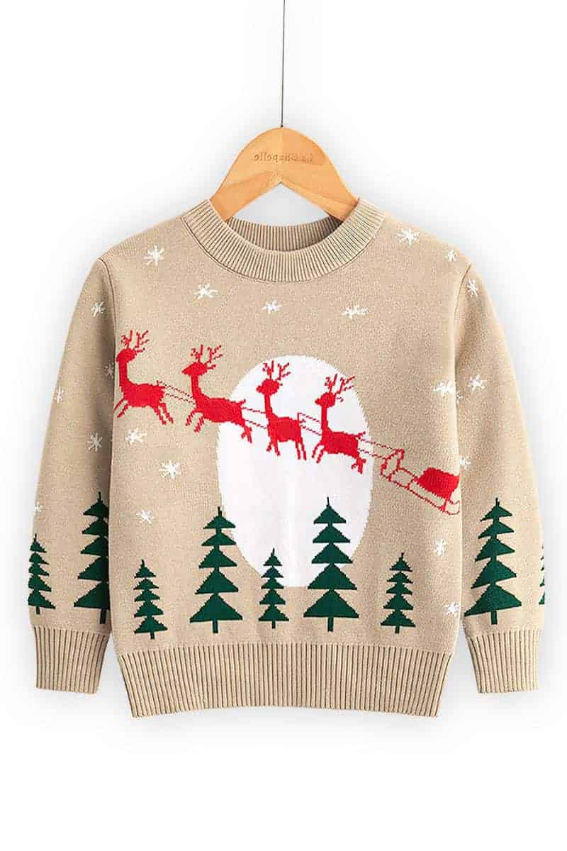 Pull de Noël enfant au charme féérique ! Sur fond beige, un magnifique traîneau rouge glisse dans le ciel étoilé, accompagné de rennes majestueux. Les sapins enneigés et flocons ajoutent une touche magique à ce classique des fêtes. Coupe confortable avec col rond, parfait pour les 2-8 ans.