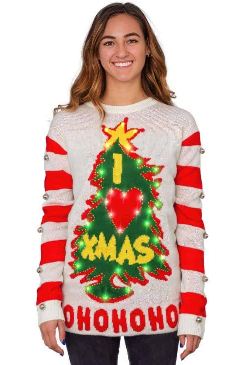 Illuminez vos fêtes avec ce pull de Noël blanc au style délicieusement kitsch ! Un sapin lumineux orné de l’inscription « I ♥ XMAS » et un joyeux « HO HO HO » en font la star des soirées festives. Coupe décontractée et confortable, manches rayées rouge et blanc pour un look 100% esprit de Noël. Disponible du S au XL.