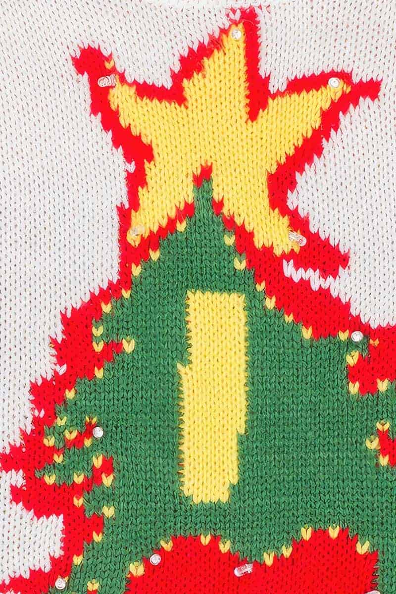 Le motif central met en scène un majestueux sapin vert bordé de rouge, couronné d’une étoile dorée étincelante. Les guirlandes lumineuses LED intégrées créent une ambiance féerique, transformant ce pull en véritable pièce maîtresse de votre garde-robe festive.