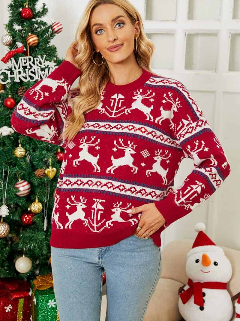 Le col rond classique s’harmonise parfaitement avec la coupe décontractée, offrant une silhouette flatteuse qui convient à toutes les morphologies. Les manches longues et la longueur classique assurent une couverture optimale pour les soirées d’hiver, tandis que la maille fine garantit une liberté de mouvement appréciable pour profiter pleinement des festivités.