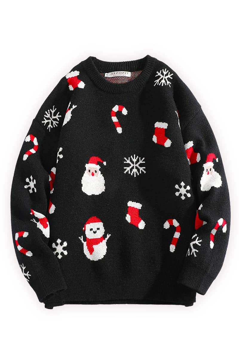 Célébrez Noël avec style dans ce pull noir festif aux motifs enchanteurs. Des Pères Noël, bonhommes de neige et flocons de neige dansent sur une maille fine et confortable. Sa coupe ample et son col rond assurent un look décontracté parfait pour vos soirées festives. Disponible du M au XXL.