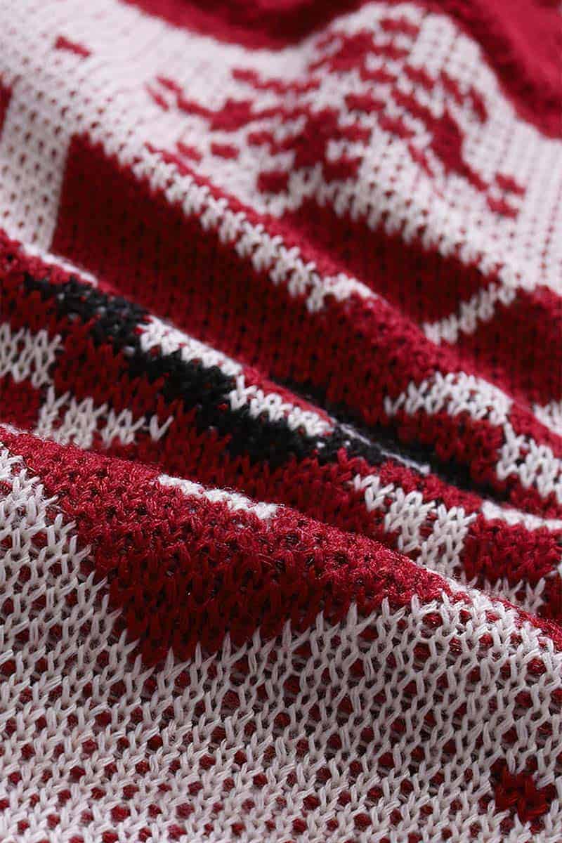 Le motif jacquard complexe met en scène un majestueux flocon de neige central, entouré d’une parade de rennes nordiques et de motifs géométriques hivernaux. La fine maille tricotée offre une texture sophistiquée qui sublime ce design traditionnel, tandis que le contraste entre le rouge profond et les motifs blancs crée un effet visuel saisissant.