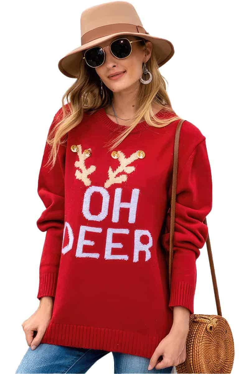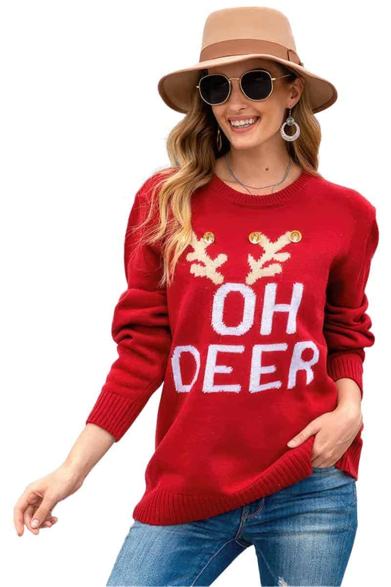 Pull de Noël « Oh Deer » en rouge avec motif de bois de renne et boutons dorés. Sa coupe décontractée et son tricot douillet en font le compagnon idéal des fêtes. Design exclusif avec inscription ludique et détails scintillants pour un look festif parfait. Disponible du S au XL.