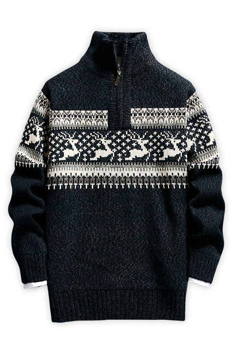 Pull de Noël zippé alliant élégance et esprit festif. Motif traditionnel de cerfs blancs sur fond noir, rehaussé de détails géométriques hivernaux. Col montant et coupe ample pour un confort optimal. La fermeture éclair et la maille épaisse en font un indispensable des fêtes, parfait pour vos soirées de Noël. Disponible du M au 3XL.